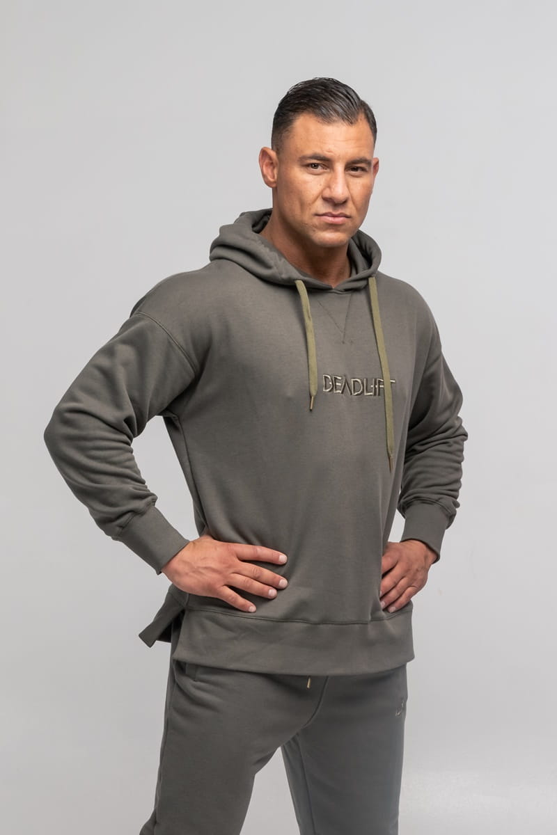 Oversizowa bluza męska z kapturem DEADLIFT w kolorze khaki. Najmodniejszy w tym sezonie kolor, stylowy design oraz najwyższej jakości materiał – wszystko to w jednym produkcie. Luźny krój oraz niezwykle miękka bawełna, z której uszyta jest bluza sprawią że będziesz czuć się komfortowo w każdej sytuacji. To bez wątpienia niezbędny element outfitu w drodze na trening lub idealne dopełnienie stylówki na siłowni.