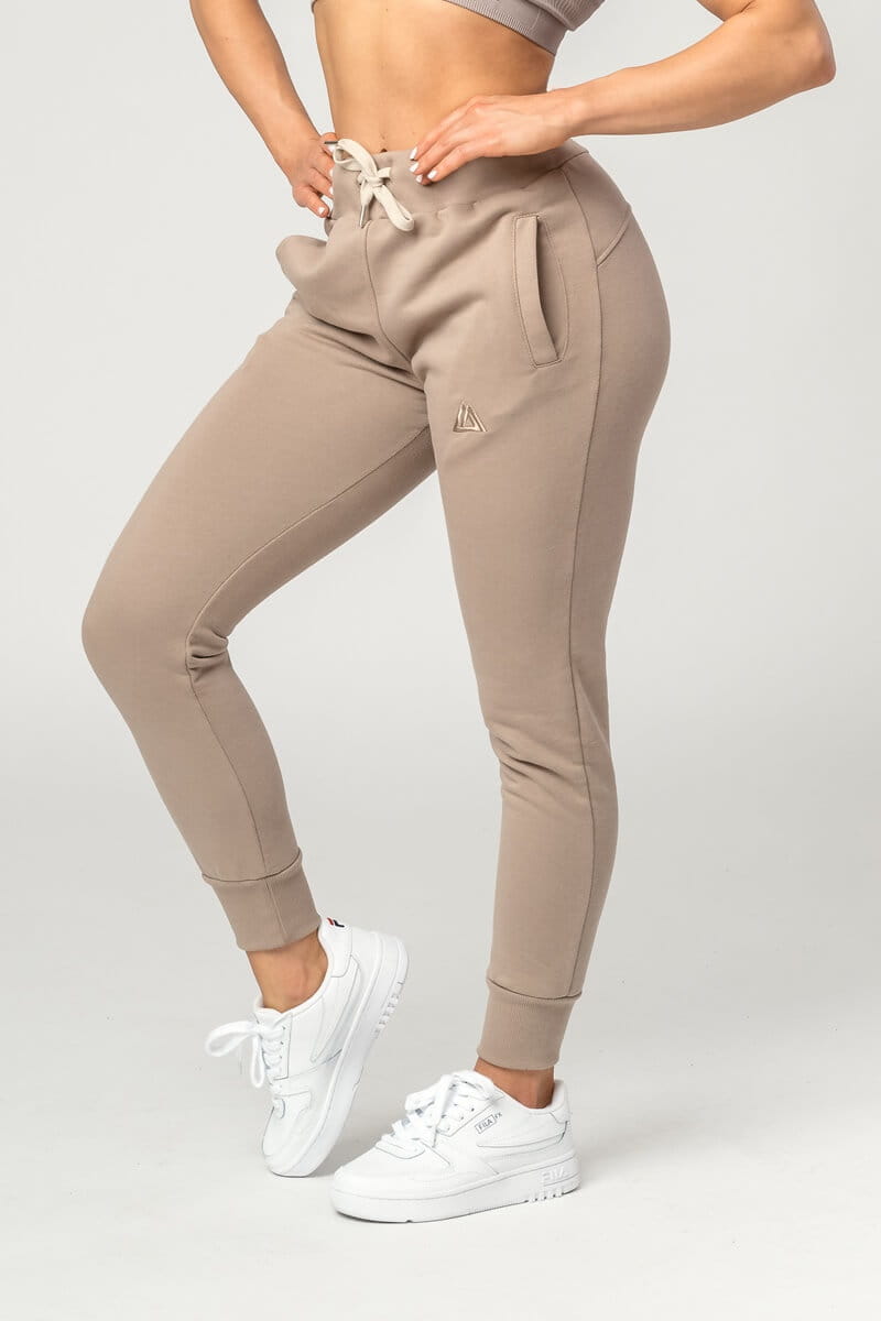 Spodnie dresowe damskie DEADLIFT w kolorze beżowym. Wysoki stan i krój uwydatniają walory kobiecej sylwetki. Świetnie wyglądają w komplecie z oversizową bluzą NUDE. Idealne nie tylko na trening, ale również jako element codziennej stylizacji.