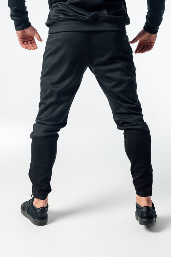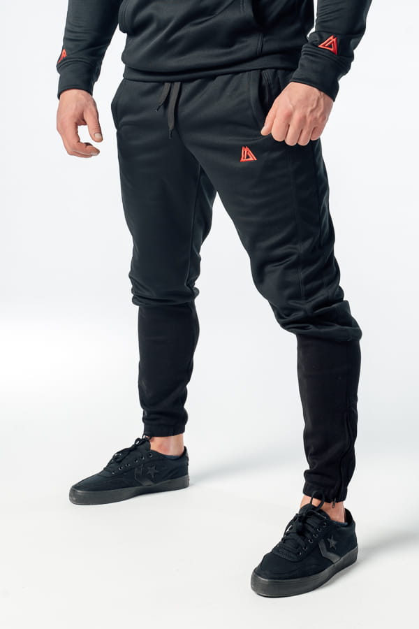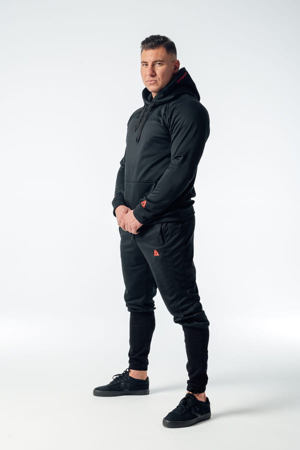 Spodnie dresowe męskie BASIC w kolorze czarnym. Dzięki specjalnemu krojowi mimo braku elastanu spodnie nie ograniczają ruchów. Doskonale sprawdzą się do treningu jak i codziennego użytku. Materiał jest miękki i przyjemny w dotyku. Nie odkształca się (m.in. spodnie nie „wybijają się na kolanach”) podczas użytkowania. Spodnie dopasowują się do kształtu sylwetki. Dolna część wykonana jest z elastycznego ściągacza z zamkiem. Sygnowane nowym skróconym logo „DL” w postaci haftu. Spodnie posiadają dodatkową kieszonkę wewnątrz kieszeni głównej (np. na telefon), wykonaną z czerwonego elastycznego materiału.