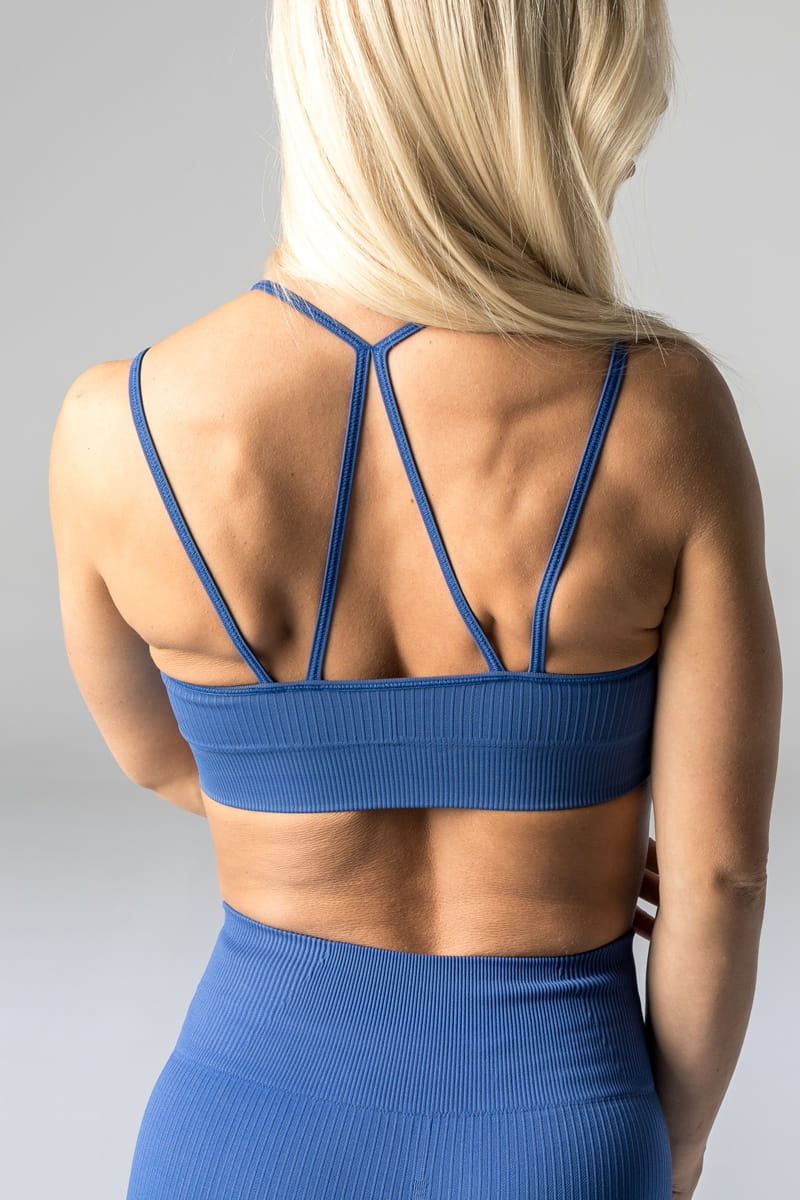 Prążkowany stanik bezszwowy w kolorze niebieskim. Delikatny, bardzo kobiecy fason. Cienkie ramiączka pozwalają wyeksponować plecy, jednocześnie zapewniając odpowiednie wsparcie podczas treningu. Stanik posiada wyjmowane wkładki, które dodatkowo podnoszą biust. Mocny, podwójny materiał zapobiega prześwitywaniu. Stanik wygląda rewelacyjnie przy każdym rozmiarze biustu.