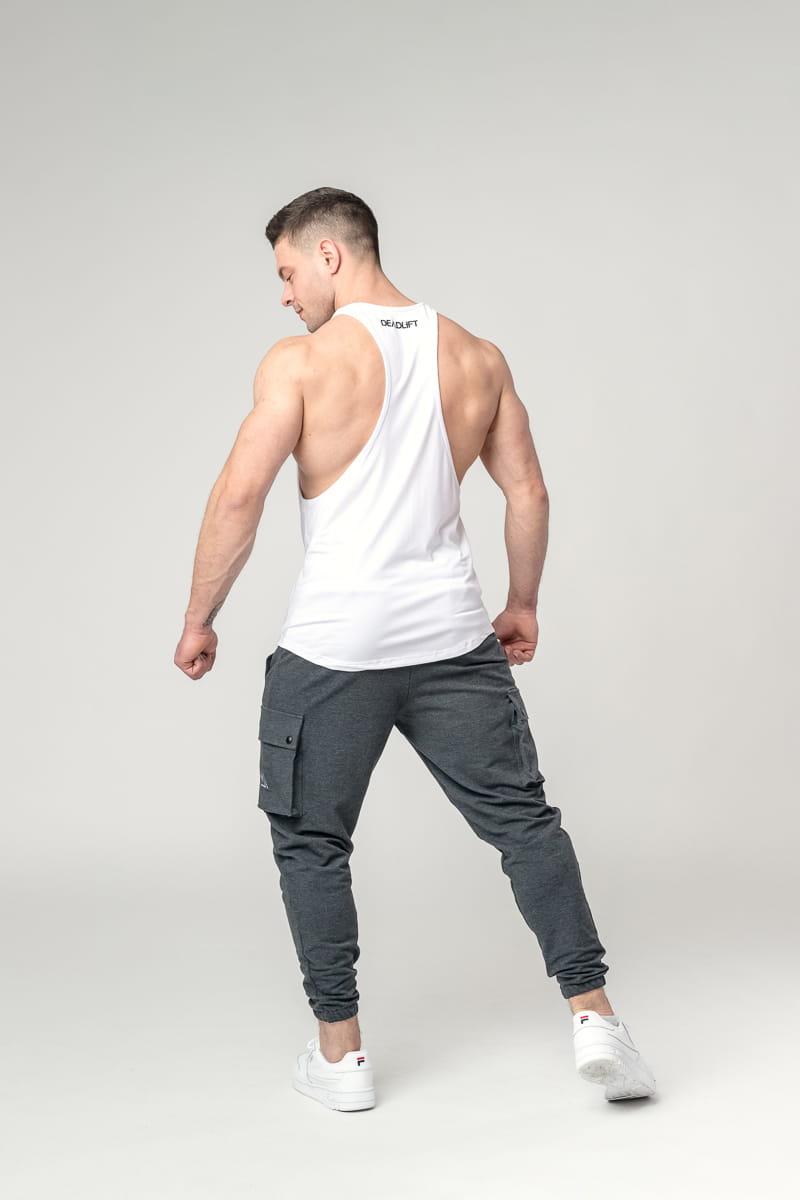 Tank top męski ELITE w kolorze białym. Praktyczny, mocno wycięty fason typu stringer idealnie sprawdzi się podczas podnoszenia ciężarów. Wycięcia pod pachami i elastyczne szwy zapewnią całkowitą swobodę ruchów i w pełni pozwolą Ci się skupić na wykonywanej serii. Wykonany z najwyższej jakości wiskozy z domieszką elastanu, znakomicie układa się na sylwetce uwydatniając jej walory.