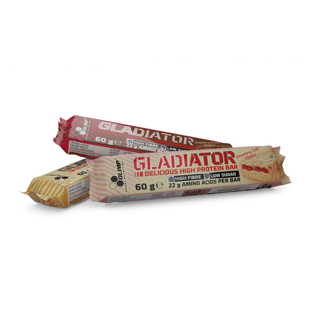 Olimp Gladiator® - Wysokobiałkowy baton (36% białka) o smaku truskawkowym, w polewie z białej czekolady. Zawiera substancje słodzące.