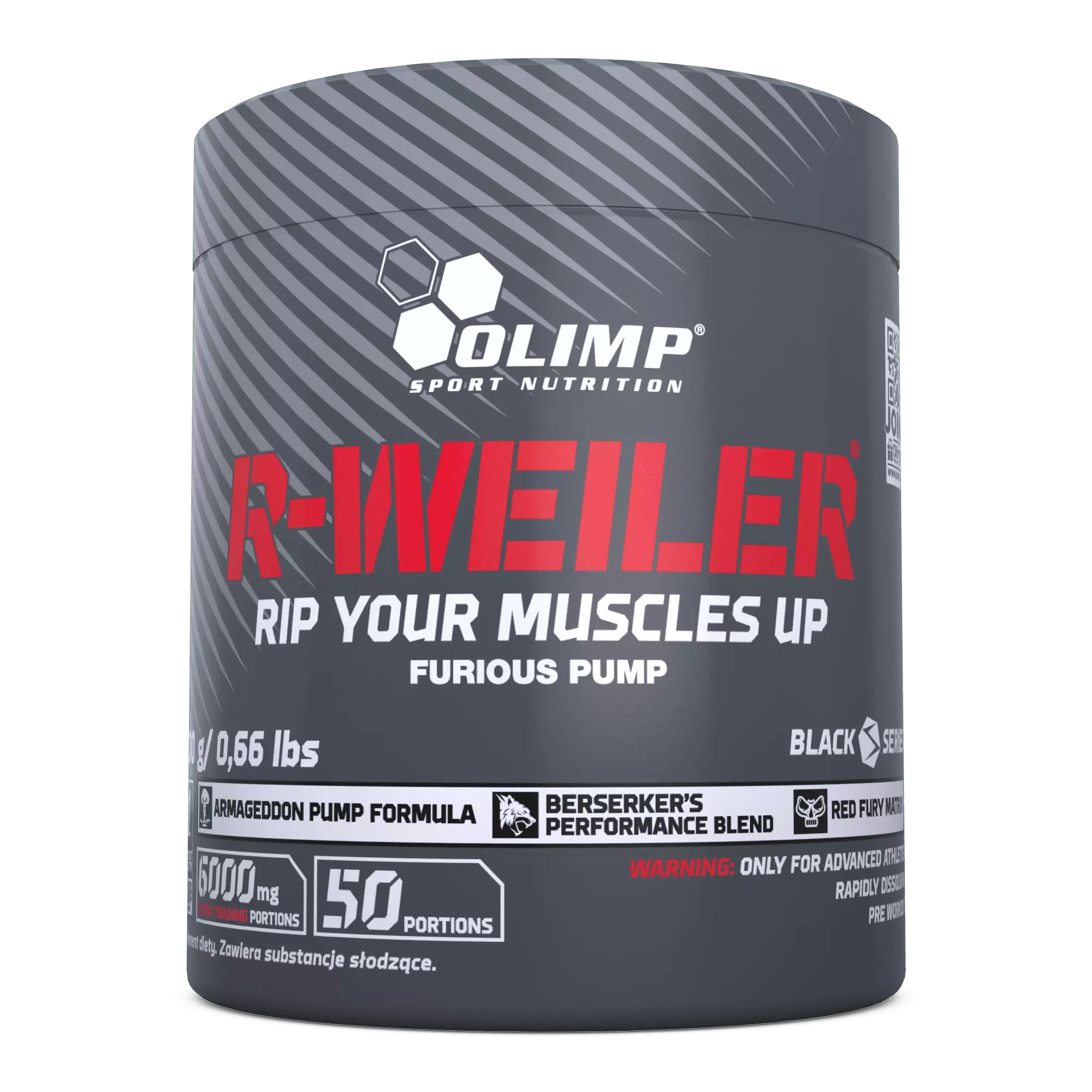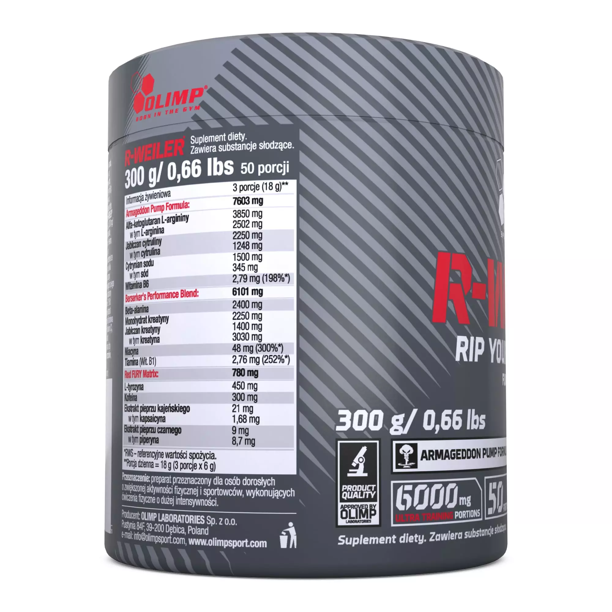 Olimp R-WEILER®. Suplement diety w postaci proszku. Zawiera substancje słodzące. Preparat stanowi kompozycję L-argininy, cytruliny, sodu, witamin (B6, tiaminy i niacyny), a także beta-alaniny, kreatyny, L-tyrozyny i kofeiny. Zawiera również ekstrakty roślinne - ekstrakt pieprzu kajeńskiego i ekstrakt pieprzu czarnego. Konsumpcja kreatyny przyczynia się do zwiększenia wydolności fizycznej podczas krótkotrwałych, powtarzających się ćwiczeń o dużej intensywności (efekt dotyczy konsumpcji 3 g kreatyny dziennie).